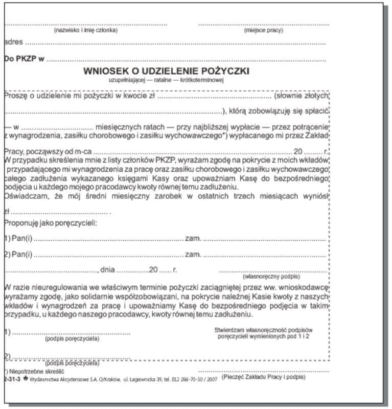 2-31-3 Wniosek o udzielenie pożyczki z PKZP, format 2/3 A5, blok 80 kartek, druk dwustronny odmienny, papier offsetowy