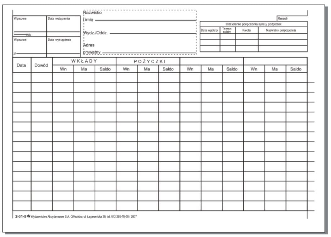 2-31-5 Dziennik kont członkowskich, format A5, blok 80 kartek, druk dwustronny odmienny, papier offsetowy