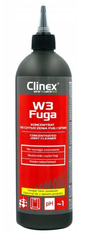 Clinex W3 Fuga do czyszczenia fug i spoin - koncentrat 500 ml, nie wymaga szorowania, skutecznie czyści fugi, działa natychmiast, wygodny aplikator umożliwia precyzyjne naniesienie preparatu na czyszczoną powierzchnię.