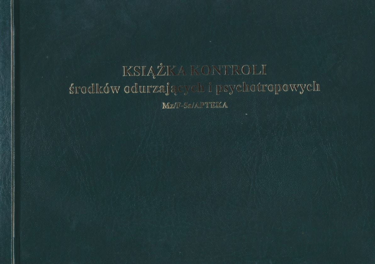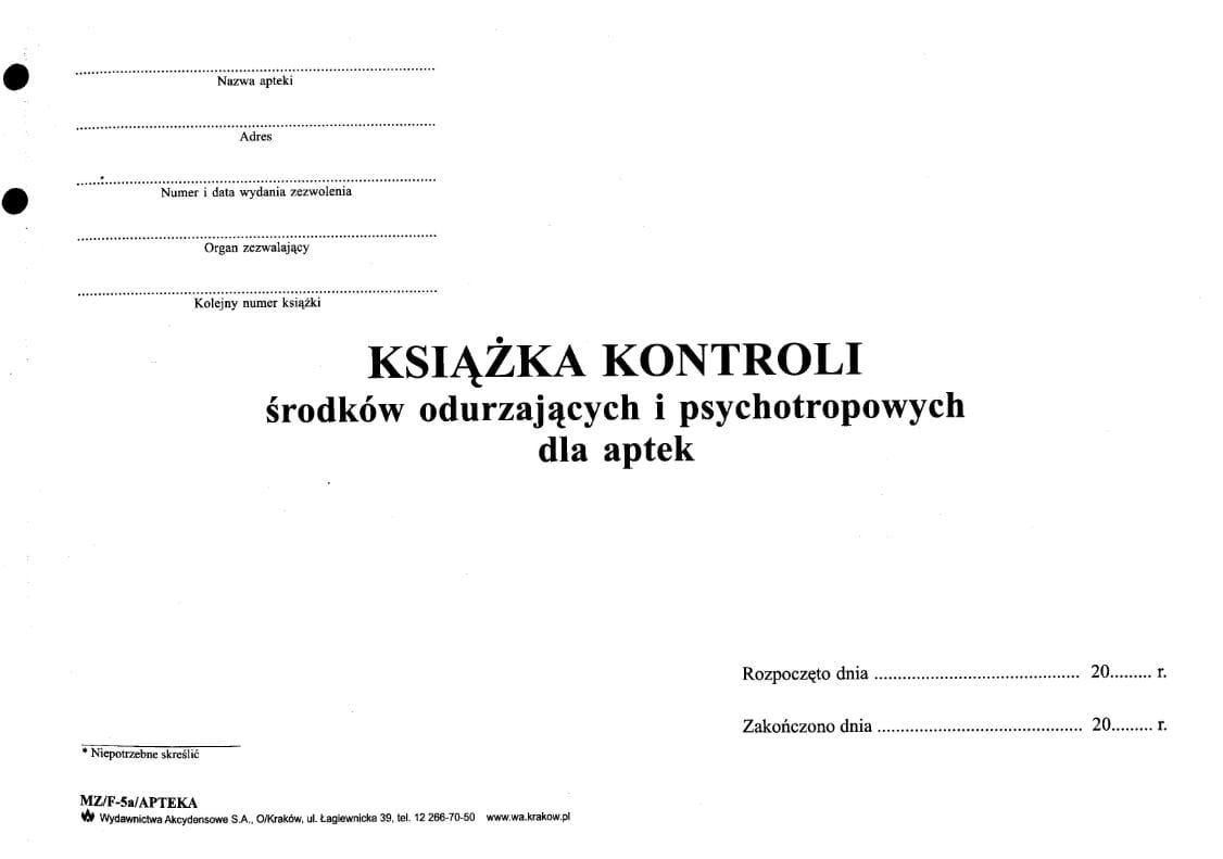 F-5A APTEKA Książka kontroli środków odurzających i psychotropowych dla aptek ogólnodostępnych, aptek zakładowych, format A4 poziom, papier offsetowy, książka paginowana 80 kart - 160 stron, oprawa twarda, blok książkowy przedziurkowany na dwie dziurki o