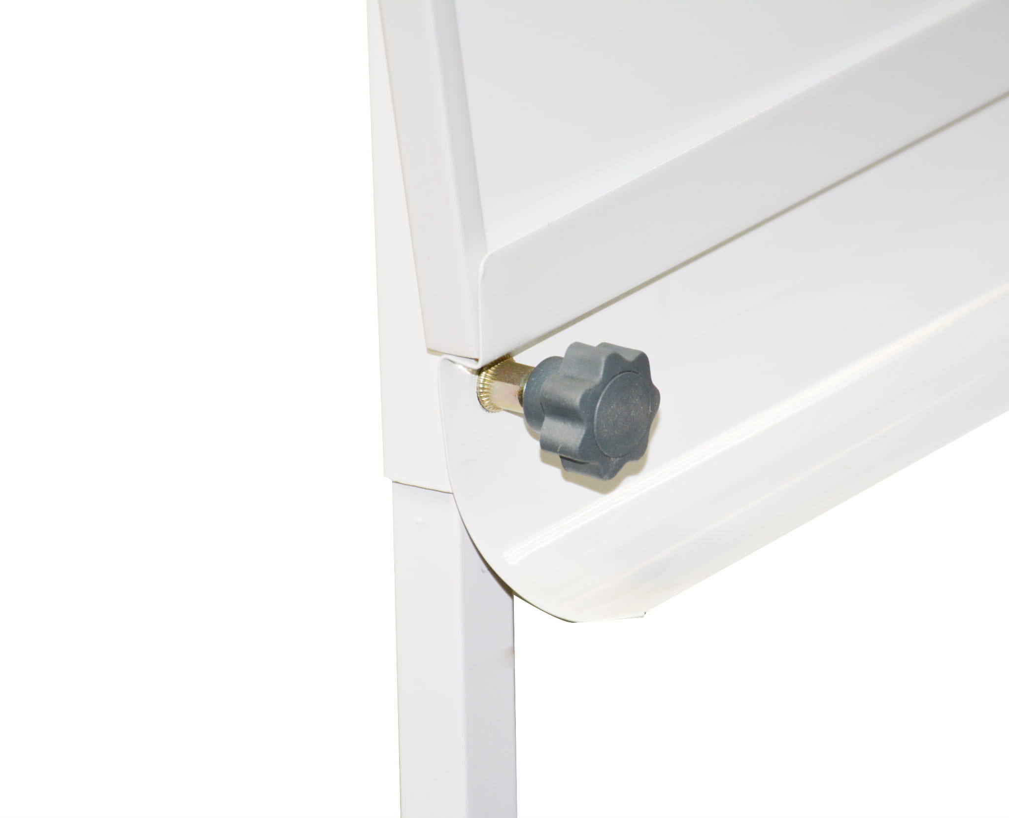 Flipchart BASIC na trójnogu, suchościeralny magnetyczny. Powierzchnia wykonana ze stali lakierowanej o grubości 2 mm w kolorze białym. Rozmiar tablicy 70x100 cm. Regulowana wysokość nóżek (180 cm). Stabilna metalowa konstrukcja, metalowy docisk do papieru