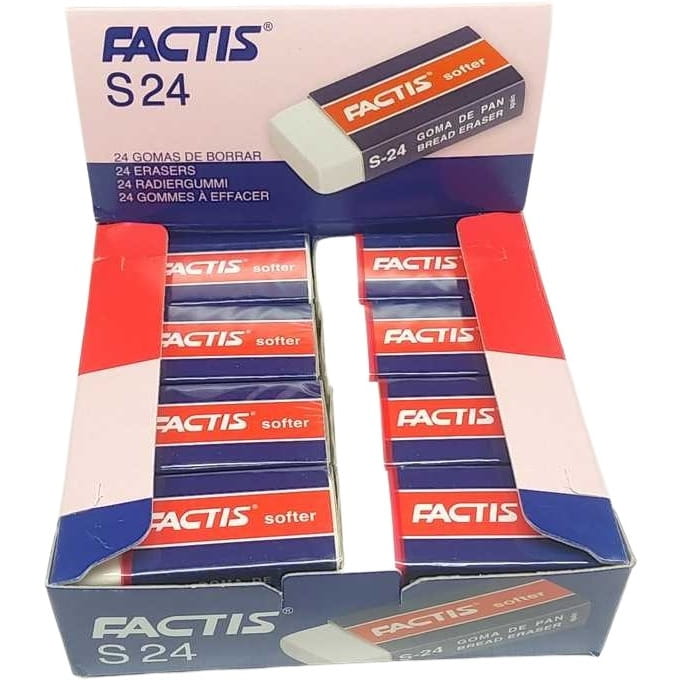 Gumka do mazania miękka, Factis S24, znakomicie sprawdza się przy wymazywaniu ołówka grafitowego, grafitu, kredek rysunkowych, nie brudzi papieru, rozmiar 50 x 23,5 x 9,5 mm