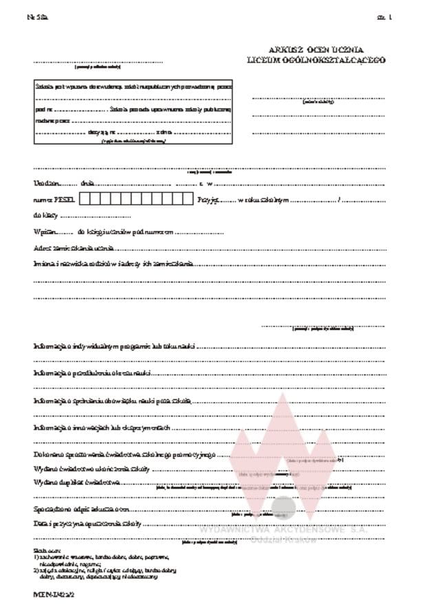 I/42a/2 Arkusz ocen dla uczniów LO