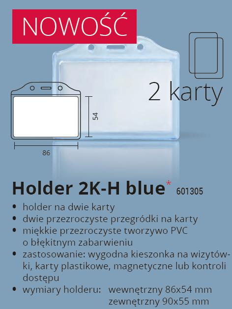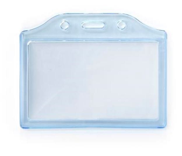 Identyfikator na dwie karty, dwie przeźroczyste przegródki ma karty, miękkie przeźroczyste tworzywo PVC o błękitnym zabarwieniu, zastosowanie: wygodna kieszonka na wizytówki, karty plastikowe, magnetyczne lub kontroli dostępu.