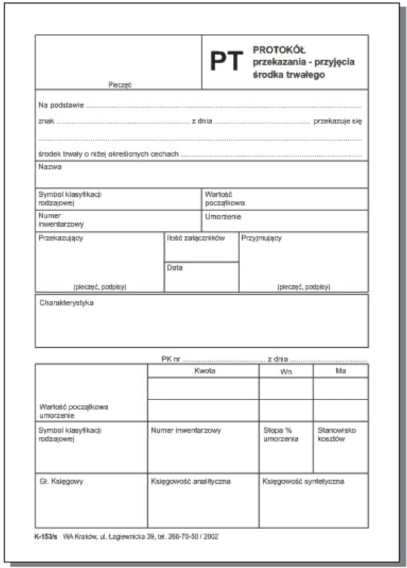 K-153/s Protokół przekazania, przyjęcia środka trwałego PT, papier samokopiujący, format A5, blok 80 kartek.