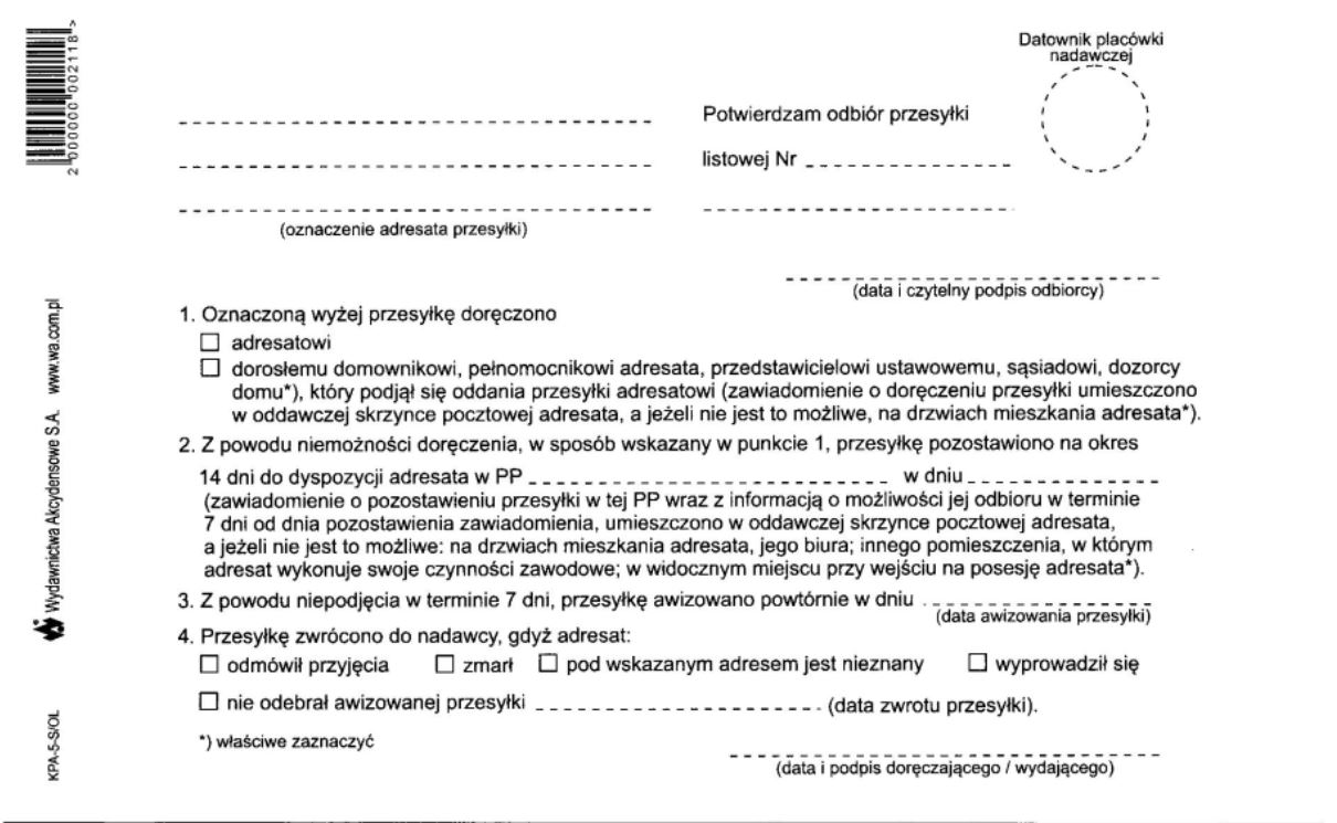 Potwierdzenie odbioru (zwrotka), 160x102 mm, 140 g, samoprzylepne, z perforacją, KPA-5-S/OL