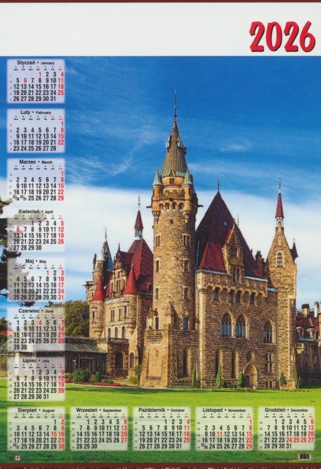 Kalendarz planszowy w formacie B1 (70x100 cm), lakierowany, z metalowymi listwami na dole i na górze kalendarza, papier kredowy, lakierowany UV
