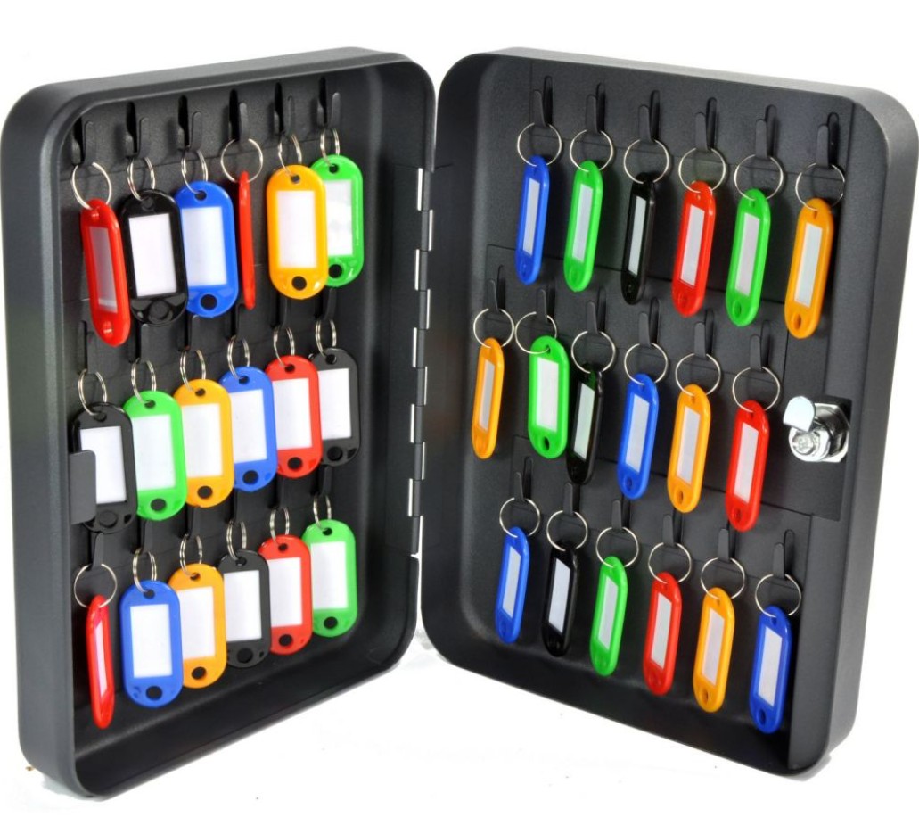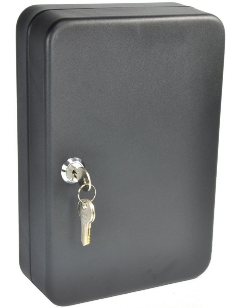 Skrzynka na 36 kluczy do zawieszenia na ścianie, z metalu, powłoka wysokiej jakości lakier proszkowy, z zamkiem kluczowym, szerokość 180 mm, wysokość 250 mm, głębokość 60 mm, w komplecie naklejki z numerami, zestaw montażowy, 3 klucze