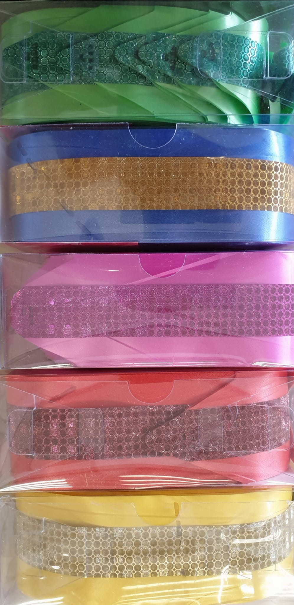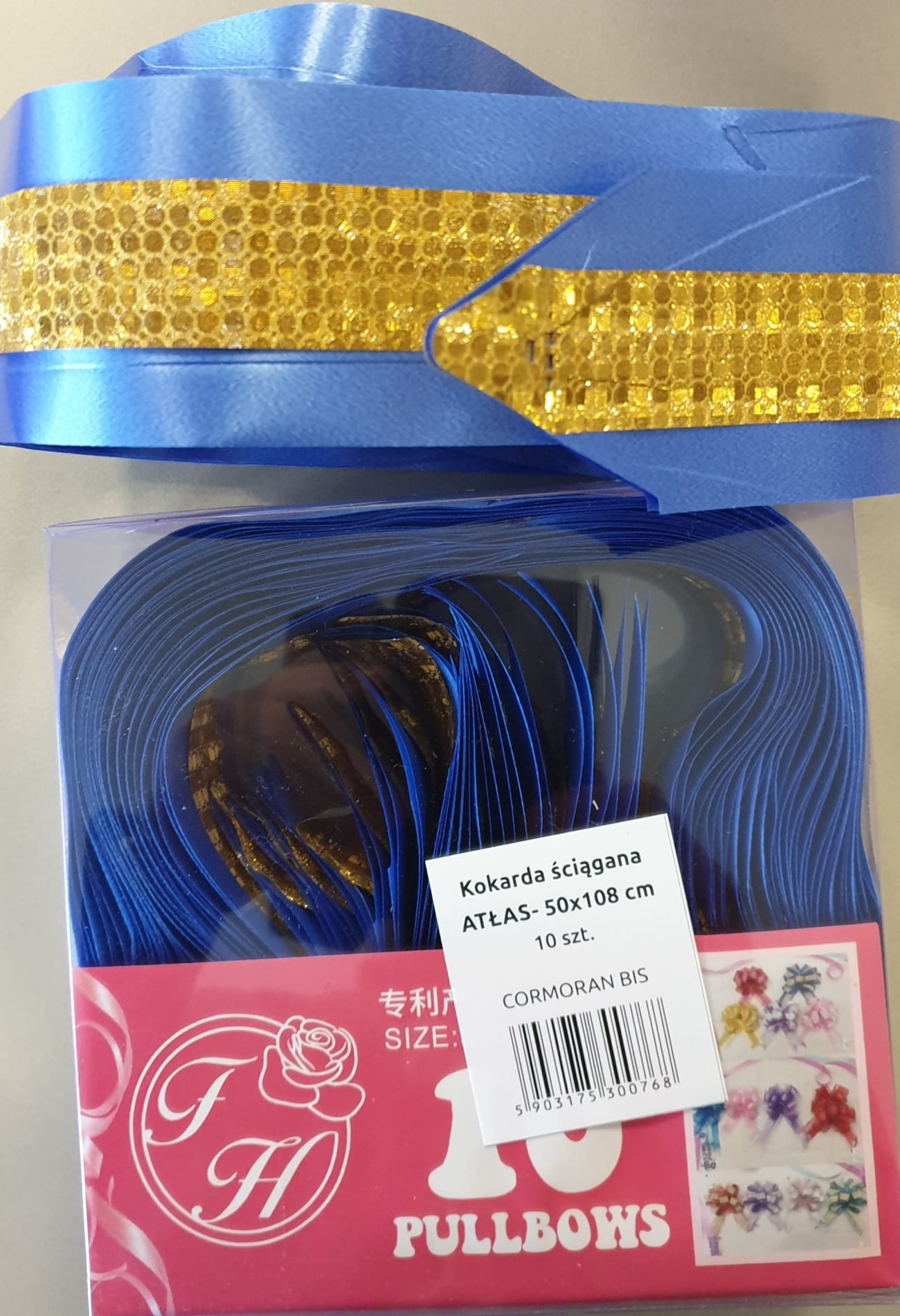 Atłasowa ściągana wstążka, z której powstaje piękna kokarda. Idealna do ozdobienia prezentów. Rozmiar: szerokość 50 mm, długość wstążki 108 cm. Kolor: niebieski atłas, złote wzory.