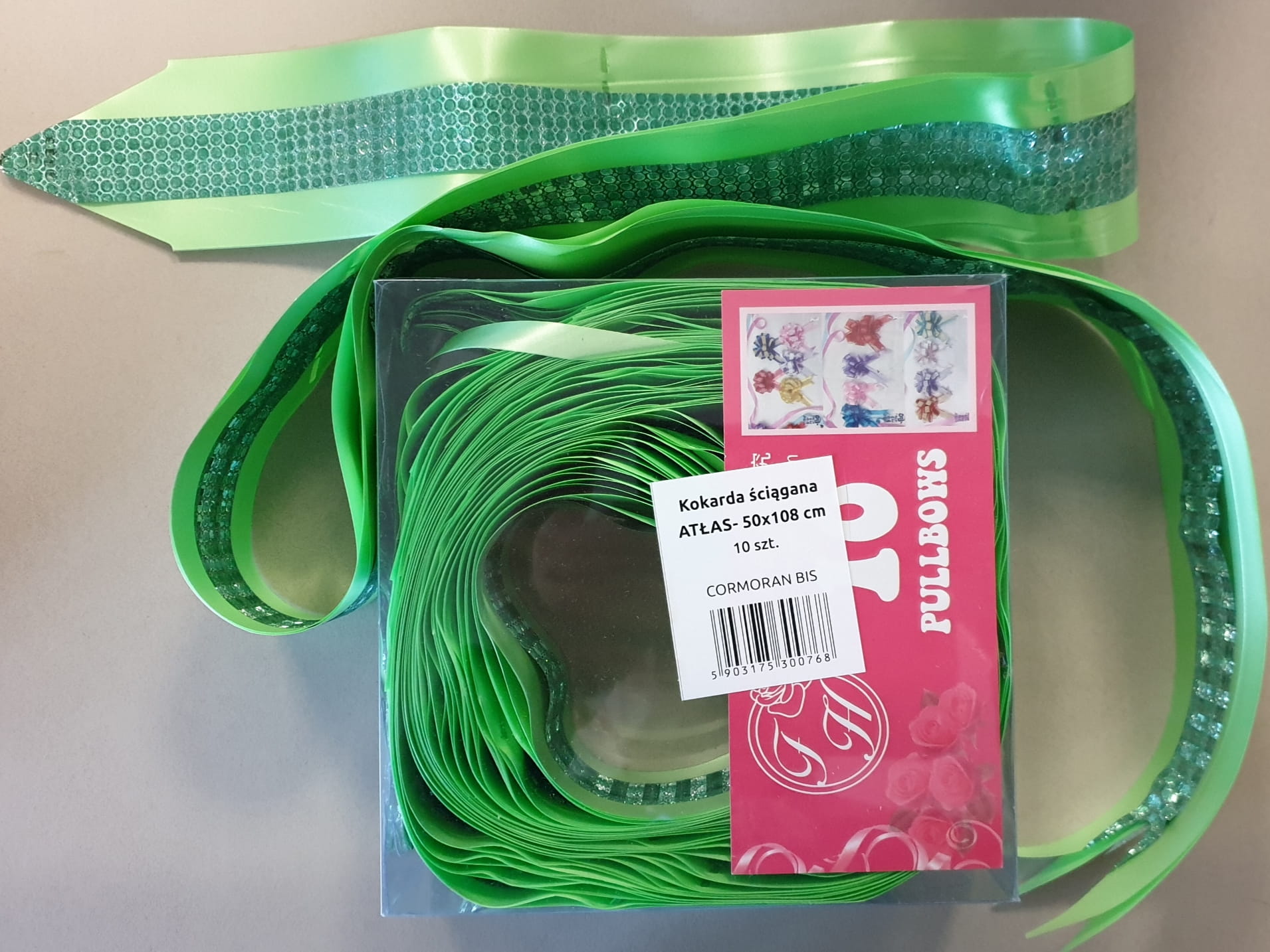Atłasowa ściągana wstążka, z której powstaje piękna kokarda. Idealna do ozdobienia prezentów. Rozmiar: szerokość 50 mm, długość wstążki 108 cm. Kolor: zielony atłas, ciemnozielone wzory.