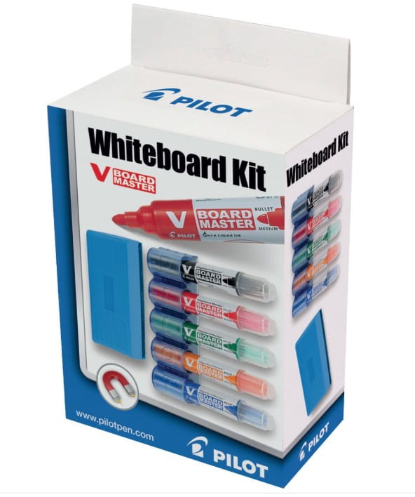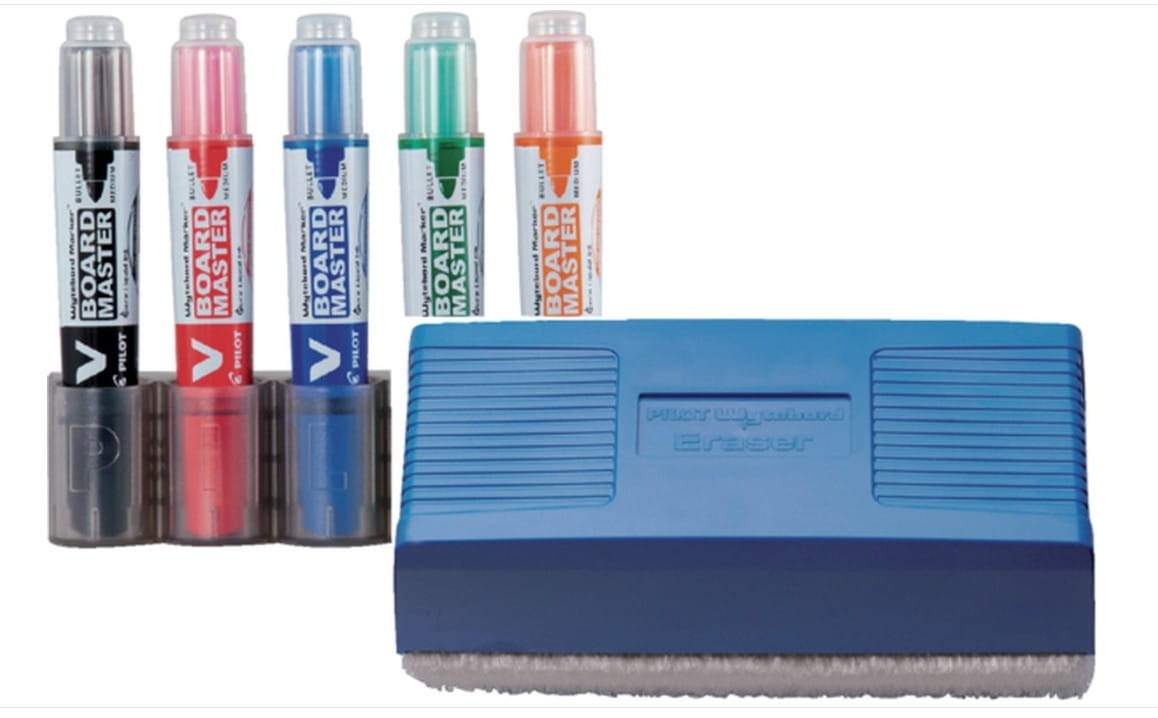 Zestaw 5 markerów do tablic V-Board Master z wymiennym wkładem (czarny, czerwony zielony, pomarańczowy i niebieski) wraz z gąbką magnetyczną i uchwytem na pisaki, grubość linii pisania 2,3 mm, rozmiar końcówki piszącej 6 mm.