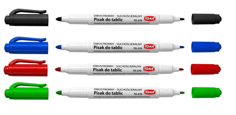 Komplet czterech dwustronnych pisaków TOMA TO-270 7, do pisania po tabliczkach i książeczkach suchościeralnych, łatwościeralny tusz proszkowy, końcówki okrągłe: 0,8 mm i 1,5 mm, czarny, czerwony, niebieski i zielony