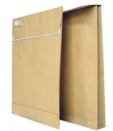 Koperta szara w formacie B-4 (250x350 mm), samoklejąca z paskiem (HK), rozszerzana na ok. 40 mm - boki i dno.
