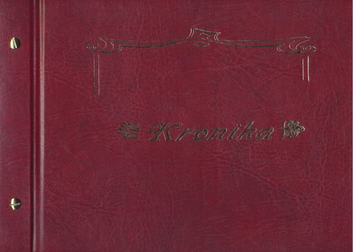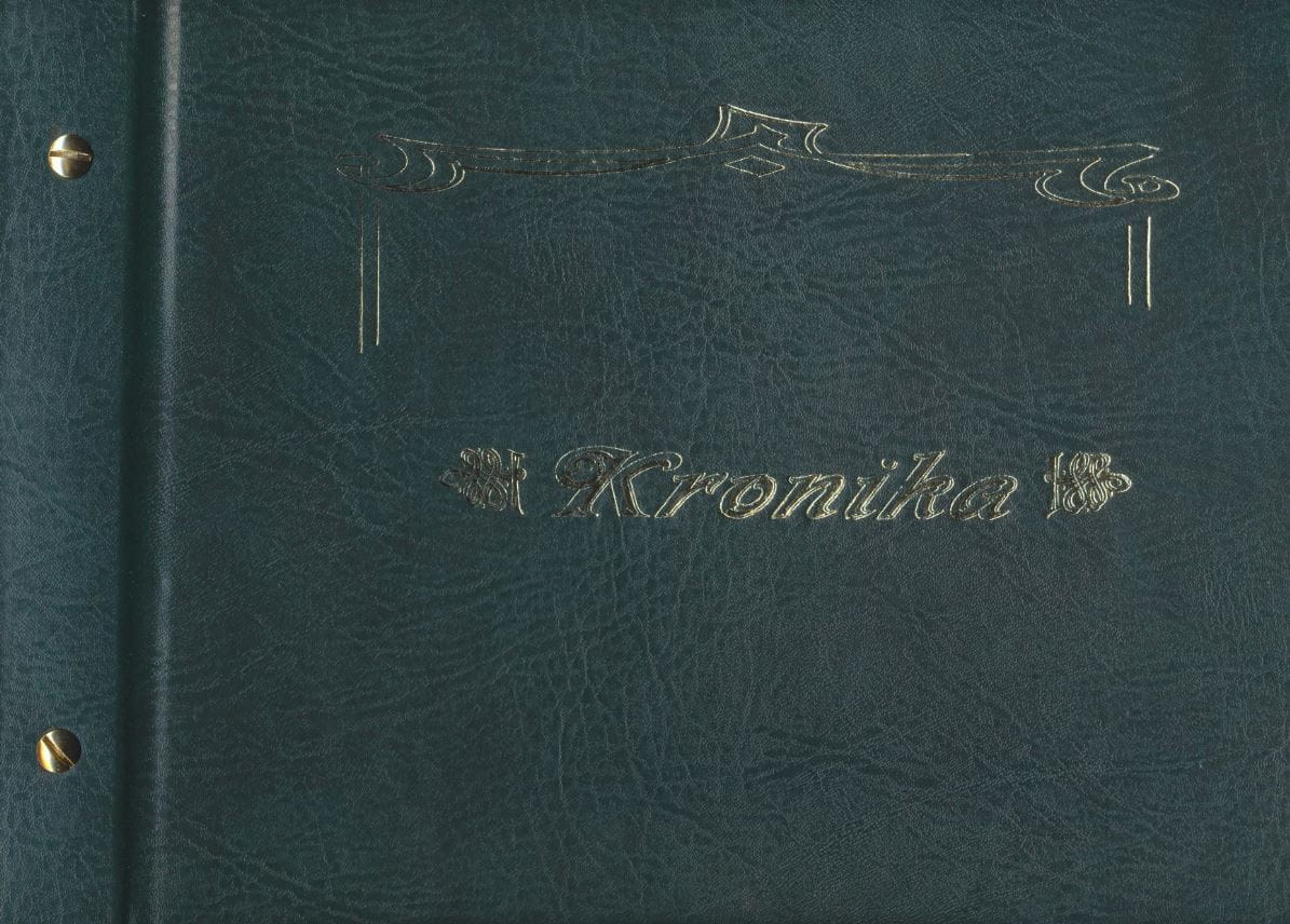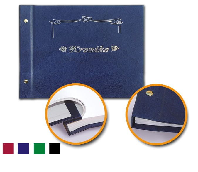 Kronika w eleganckiej oprawie introligatorskiej, grzbiet skręcony złotymi wkrętami, z ozdobnym napisem "KRONIKA". w formacie A4 - układ poziomy, wewnątrz 100 białych kartek, na pionowym boku ozdobne złote nity, dostępna w 4 kolorach: granat, bordo, zieleń