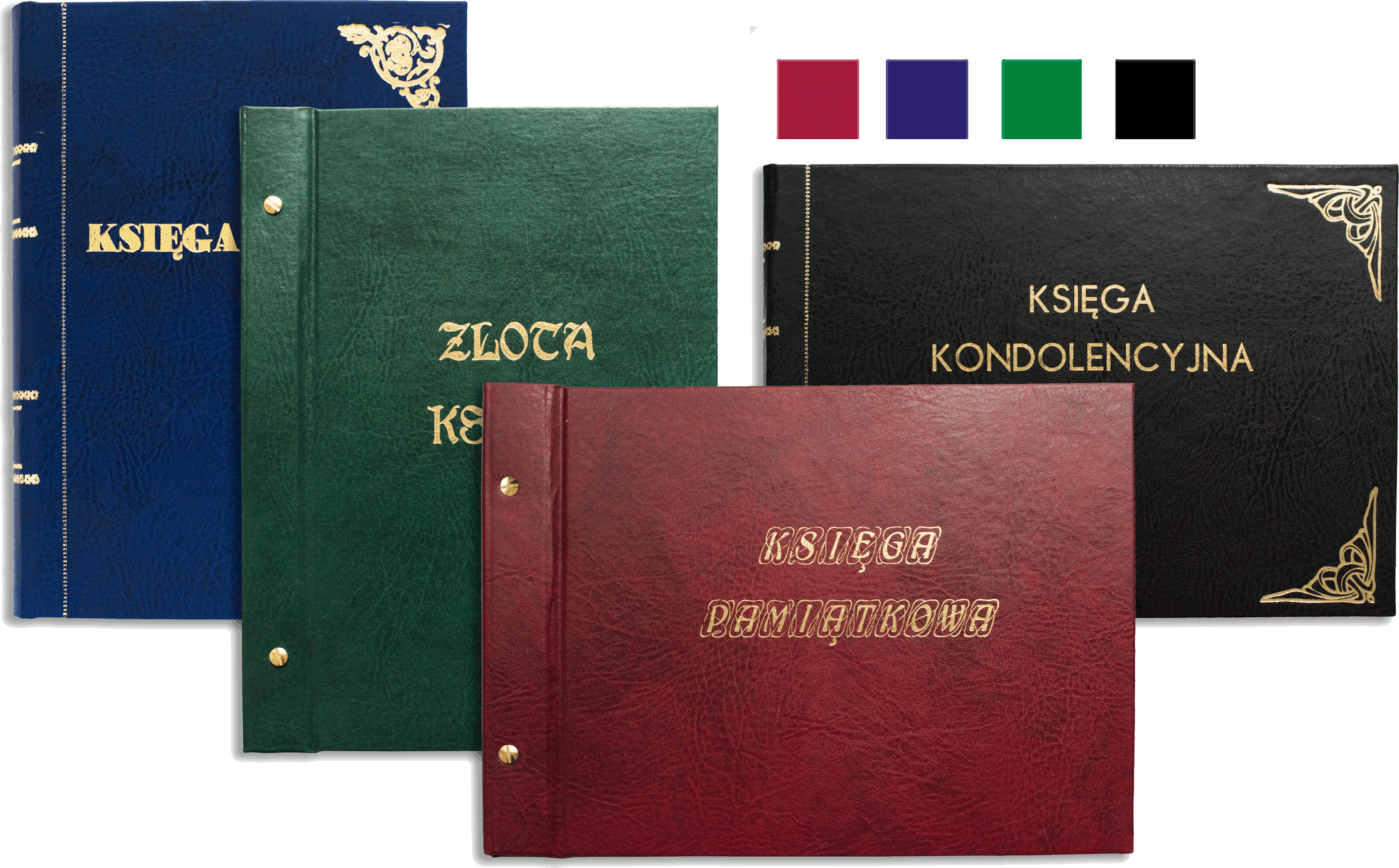 Księga Pamiątkowa w eleganckiej oprawie introligatorskiej, szyta, z ozdobnym napisem "Księga Pamiątkowa", wewnątrz 160 białych kartek, w formacie A3, układ poziomy, dostępna w kolorze: czarnym, bordowym, granatowym i zielonym.