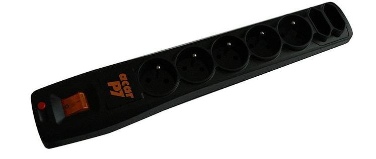 P7 to zabezpieczenie przeciwprzepięciowe aż siedmiu urządzeń, Pięć gniazd z bolcem i dodatkowo dwa gniazda płaskie, podświetlany wyłącznik, wygodny, automatyczny bezpiecznik, cztery możliwe kierunki ułożenia sznura sieciowego, kabel 1,5 metra