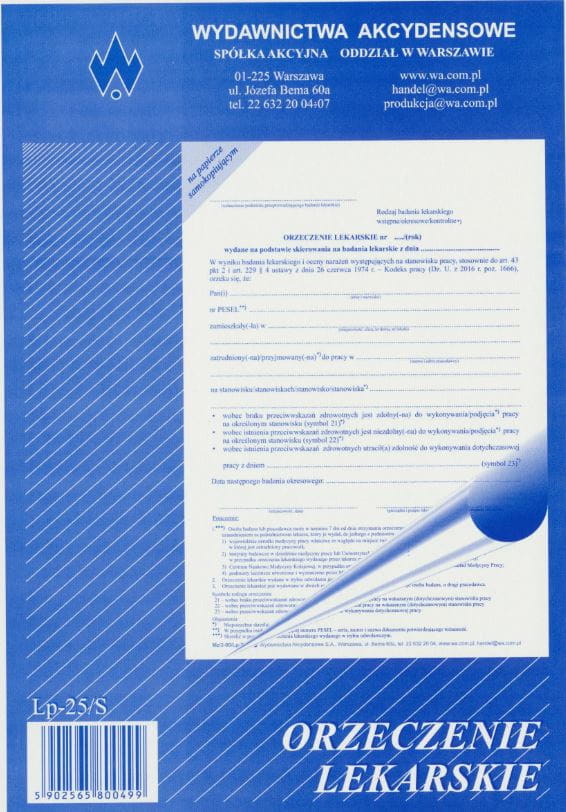 Lp-25/s Orzeczenie lekarskie wydane na podstawie skierowania na badanie lekarskie ZAŁ 2, format A5, blok 80 kart na papierze samokopiującym