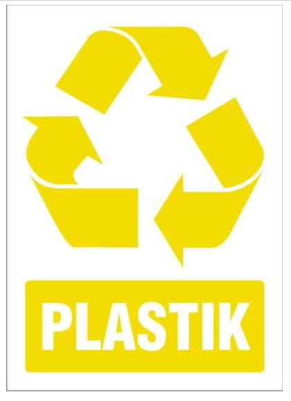 Naklejka - PLASTIK, przeznaczona do przyklejenia na pojemnik z odpadami dla wskazania miejsca gromadzenia odpadów danego rodzaju, rozmiar 150 x 210 mm, z folii samoprzylepnej PCV, można stosować na zewnątrz - odporne na działanie warunków atmosferycznych.