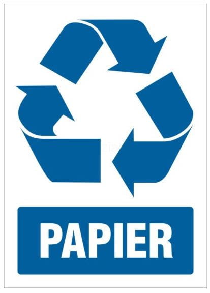 Naklejka - PAPIER, przeznaczona do przyklejenia na pojemnik z odpadami dla wskazania miejsca gromadzenia odpadów danego rodzaju, rozmiar 150 x 210 mm, z folii samoprzylepnej PCV, można stosować na zewnątrz - odporne na działanie warunków atmosferycznych.