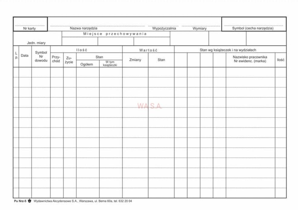 Nrz-5 Karta narzędziowa ilościowo-wartościowa, format A5, karton, druk dwustronny.
