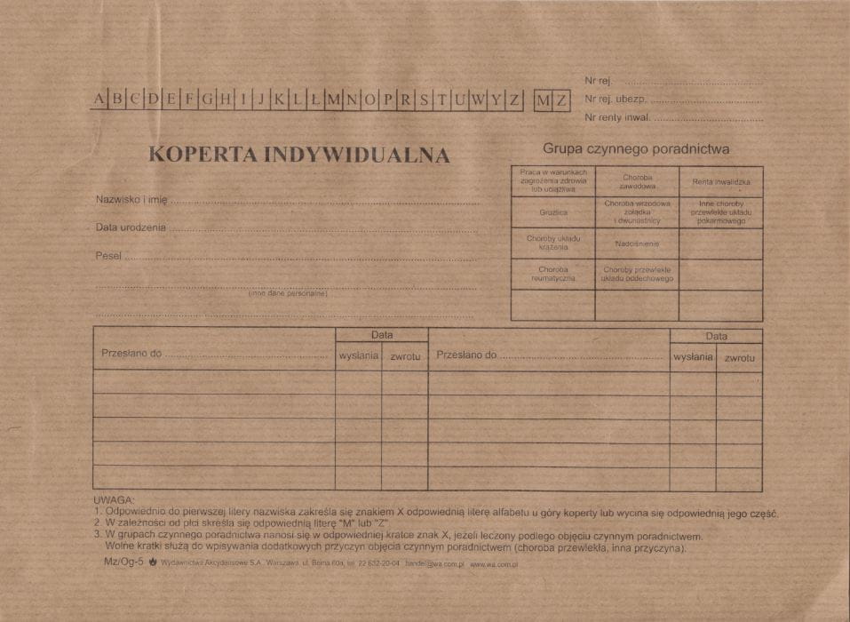 Og-5/W Koperta indywidualna, format 176x237 mm (krótsza od formatu B5), papier brązowy prążkowany (natron), sztuki, nadruk jednostronny, przeznaczona do przechowywania kart historii choroby pacjentów oraz innej dokumentacji.