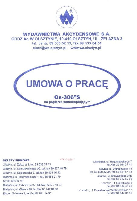 Umowa o pracę, A-4, 30x2 karty, samokopia, OS-306-S Papier samokopiujący, format A4, blok 30x2 karty, nadruk niebieski (oryginał) i czerwony (kopia)