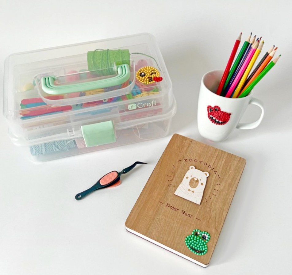 Naklejki emotikony i dinozaury do ręcznego wykonania haftem diamentowym, 12 naklejek z transparentną, podkolorowaną folią do wyklejenia kolorowymi diamencikami, kolorowe, akrylowe diamenciki - 12 kolorów w oddzielnych woreczkach, tacka do segregowania k