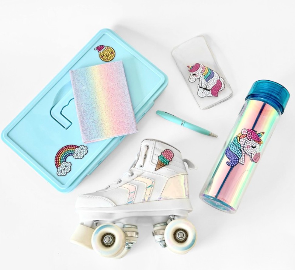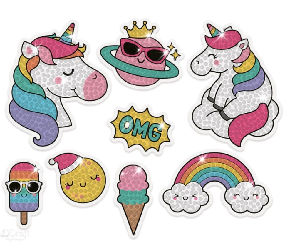 Naklejki jednorożce do ręcznego wykonania haftem diamentowym, 8 naklejek z transparentną, podkolorowaną folią do wyklejenia kolorowymi diamencikami, kolorowe, akrylowe diamenciki - 10 kolorów w oddzielnych woreczkach, tacka do segregowania, aplikator rys