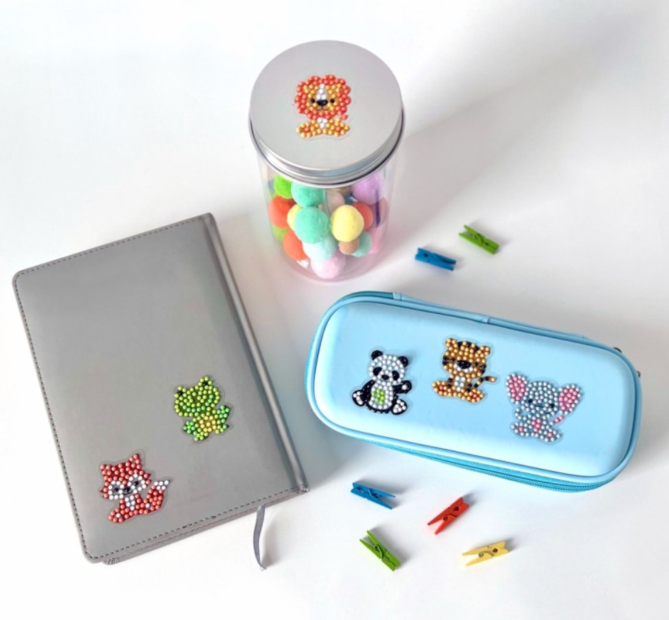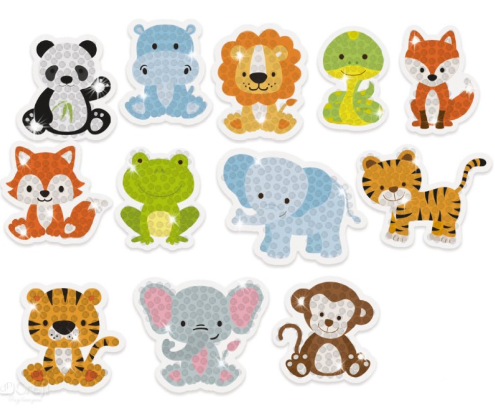 Naklejki zwierzęta do ręcznego wykonania haftem diamentowym, 12 naklejek z transparentną, podkolorowaną folią do wyklejenia kolorowymi diamencikami, kolorowe, akrylowe diamenciki - 13 kolorów w oddzielnych woreczkach, tacka do segregowania, aplikator rysi