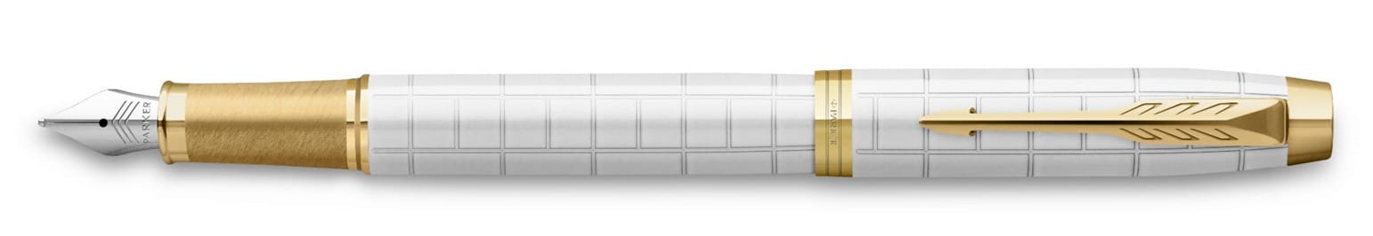 Pióro wieczne Parker IM Premium Perłowe GT, korpus jest pokryty perłowym lakierem i asymetrycznym grawerowaniem w kwadraty ze złotym wykończeniem, stalówka wykonana jest z trwałej stali szlachetnej rozmiar F (Fine).
