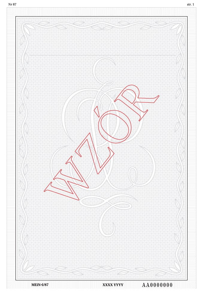 Gilosz formatu 2xA4 w kolorze szarym, o symbolu MEN I/87 numerowany. Wykorzystywany do poddruku dla duplikatu, o którym mowa w rozporządzeniu MINISTRA EDUKACJI I NAUKI z dnia 7 czerwca 2023 r.