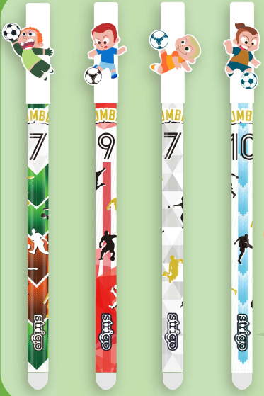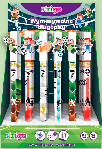 Długopis wymazywalny PETITE Football, STRIGO SSC193, wymazywalny, grubość linii 0.5 mm, kolor tuszu niebieski. Kolorowe długopisy wymazywalne z motywami z serii Piłka nożna, dostępne 4 wzory.