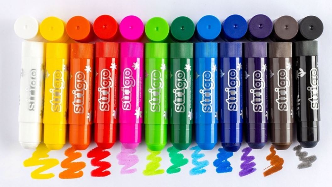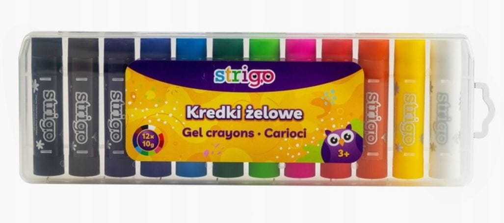 Kredki żelowe w sztyfcie STRIGO SSC035 12 kolorów, bardzo miękkie, przez co gładko suną po powierzchni papieru, kartonu i drewna, można nimi rysować dowolne kształty i rozcierać je palcami.