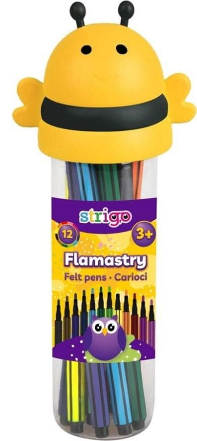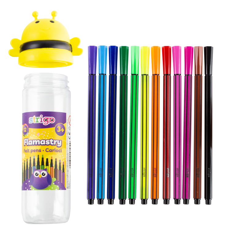 Flamastry Pszczółka STRIGO SSC289 w 12 żywych intensywnych kolorach, zamknięte w wygodnym okrągłym opakowaniu zakończone wizerunkiem liska. Specjalnie zaprojektowane flamastry sprawdzą się jako niezbędnik do wyprawki szkolnej, dzięki swojemu kształtowi, z