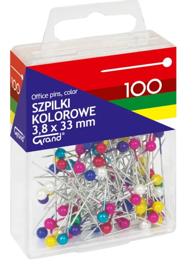 Szpilki uniwersalne z kolorowymi główkami, GRAND T4, miks kolorów w pudełku, rozmiar 3,8 mm x 33 mm, pakowane w pudełka po 100 sztuk, idealne do dekoracji i ozdób.