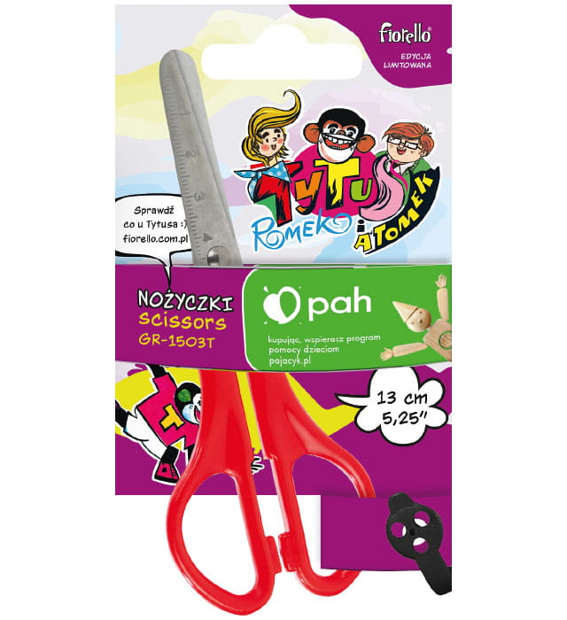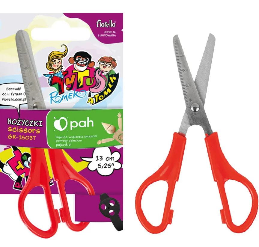 Nożyczki Fiorello 5,25 GR-1503T – 13 cm SZKOLNE Tytus, Romek i A”Tomek, wysokiej jakości nożyczki z nierdzewnej, hartowanej stali, ergonomiczne uchwyty z tworzywa sztucznego w różnych kolorach, okrągłe końcówki, rozmiar 5,25” (13 cm), edycja limitowana.
