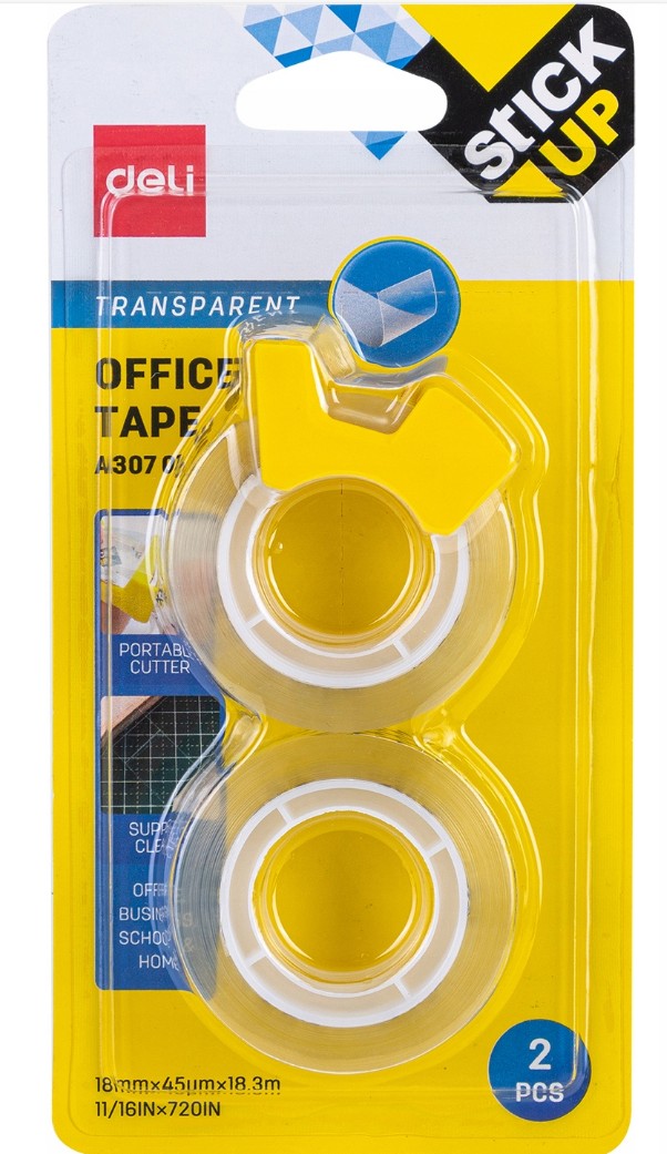 Taśma DELI EA30701 w zestawie z kompaktowym narzędziem ułatwiającym odrywanie kawałków taśmy, przezroczysta, długość 18,3 m, szerokość 18 mm, akrylowa, opakowanie 2 sztuki