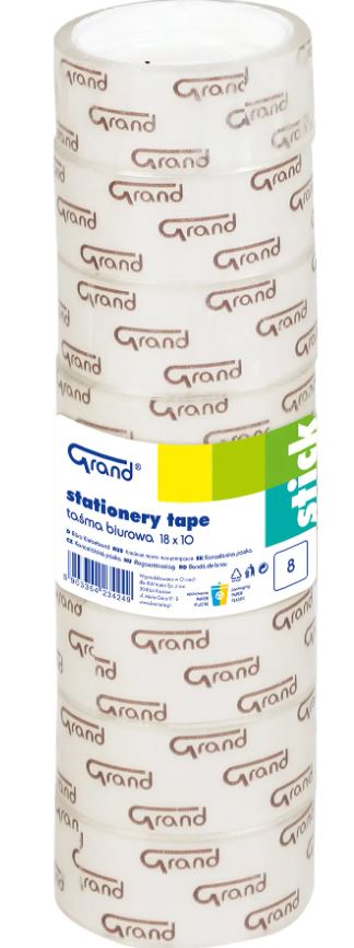 Taśma biurowa GRAND 18x10, idealnie przezroczysta taśma klejąca, bezwonna, wykonana z polipropylenu, grubość 40 mikronów, pokryta emulsyjnym klejem akrylowym, nie zawiera rozpuszczalników organicznych, stabilna substancja klejąca odporna na działanie świa