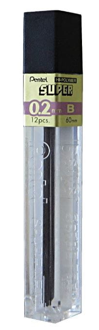 Pentel C502-B Hi-Polymer Super 0.2 mm, grafity ołówkowe wykonane z żywicy syntetycznej, grafitu i węgla, wyjatkowo trwałe i elastyczne, 12 sztuk o długości 60 mm.