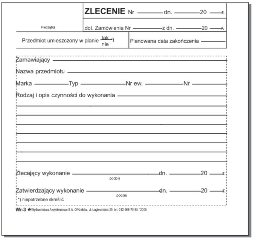 Wr-3 Zlecenie warsztatowe, format 2/3A5, blok 80 kartek, druk jednostronny, papier offsetowy