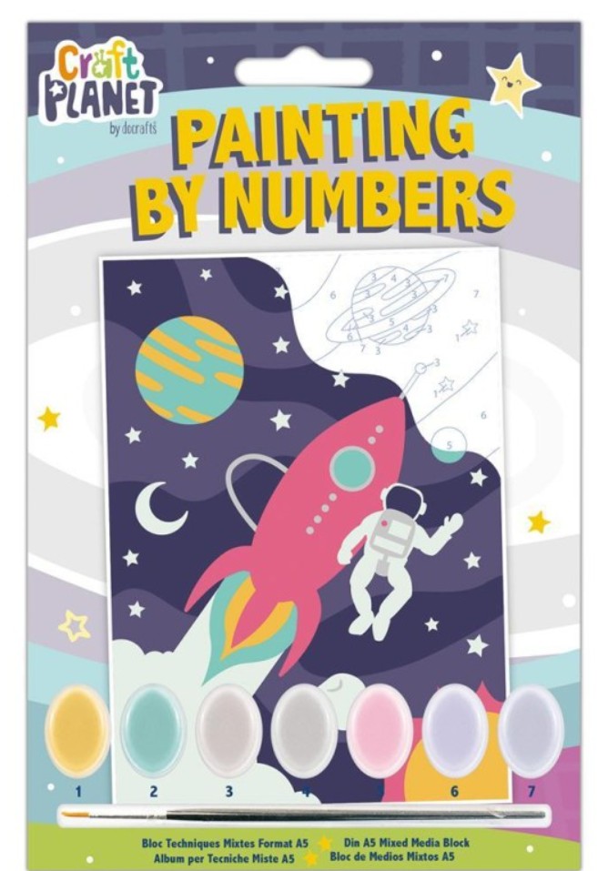 Zestaw do malowania po numerach - Craft Planet - Kosmos. Zestaw zawiera: tekturowe podobrazie A5 (210 x 148 x 1,5 mm), 7 pojemników z farbą akrylową i pędzelek.