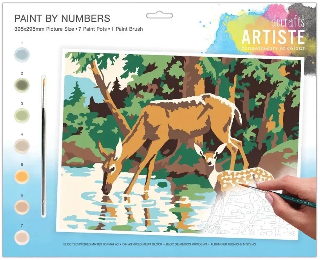Duży zestaw do malowania po numerach - artiste - woodland deer. Zestaw zawiera: tekturowe podobrazie płótno 395 X 395 mm, 7 pojemników z farbą akrylową, pędzelek.