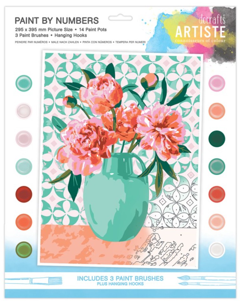 Duży zestaw do malowania po numerach - artiste - beautiful bouquet. Zestaw zawiera: tekturowe podobrazie 395 x 295 x 2 mm, 14 pojemników z farbą akrylową i 3 pędzelki.