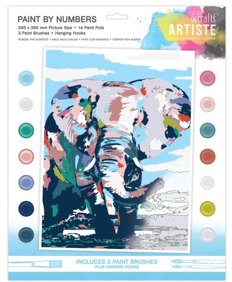 Duży zestaw do malowania po numerach - artiste - noble elephant. Zestaw zawiera: tekturowe podobrazie 395 x 295 x 2 mm, 14 pojemników z farbą akrylową i 3 pędzelki.